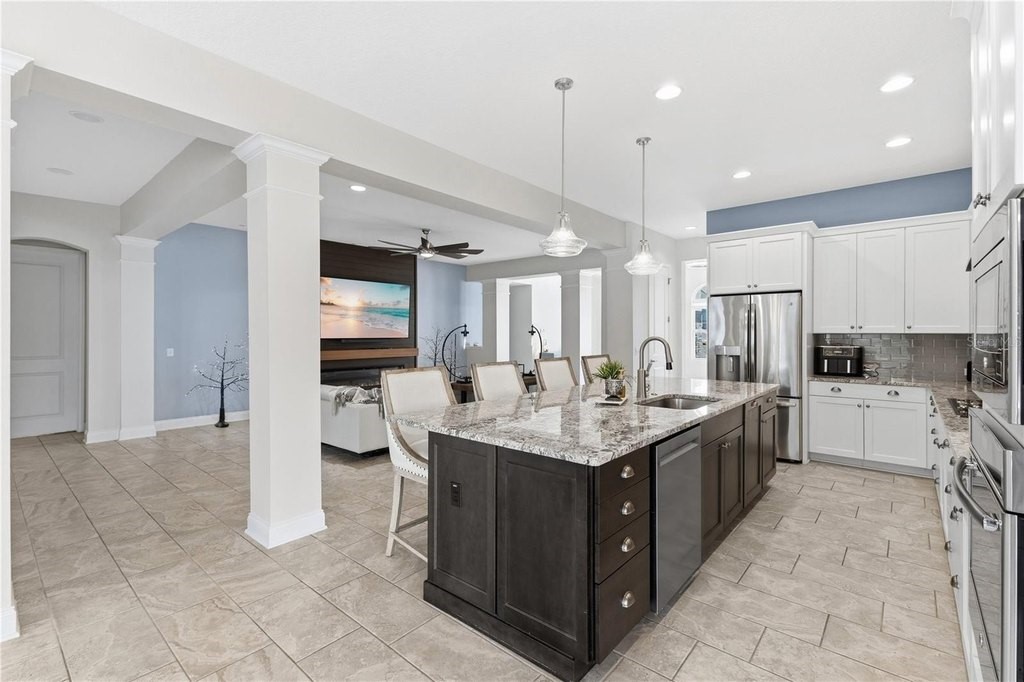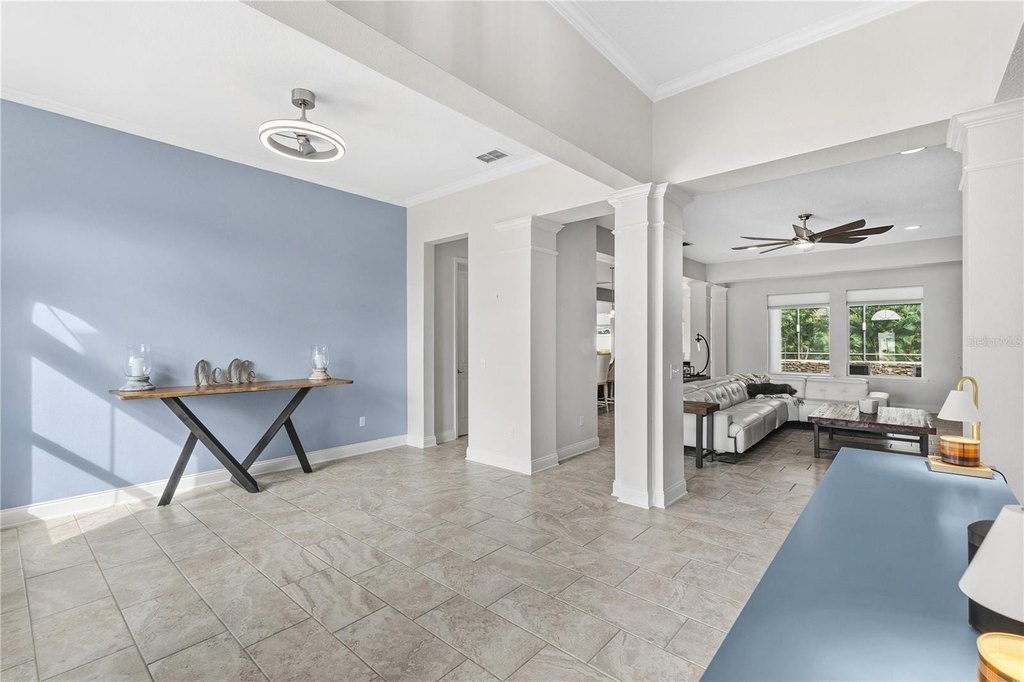 Exceptional one story home, perfectly situated on an oversized corner lot with views of Johns Lake. Thoughtfully designed open floor plan creates comfortable spaces for family lifestyle. Soaring ceilings and abundant natural light throughout. The elegant living room features a built-in fireplace, creating a warm and inviting atmosphere with views of the tropical outdoor pool. The gourmet kitchen is a chef's dream, equipped with granite countertops, stainless steel appliances, and ample cabinetry. The expansive primary bedroom includes a luxurious ensuite bathroom with a super shower, double sinks, granite counters, and a spacious walk-in closet. The versatile bonus retreat area includes a 2nd bathroom and two additional bedrooms, offering a private area for family and guests. The outdoor space is truly the highlight, with a magnificent solar heated pool and outdoor patio. The home is conveniently located near shopping, dining, major highways, and top-rated schools. This home truly combines comfort, style, and convenience!